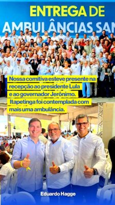 Ao lado do presidente Luiz Inácio Lula da Silva e do governador Jerônimo Rodrigues, o gestor recebeu para Itapetinga um conjunto UBS, uma Unidade Odontológica Itinerante, uma viatura para o SAMU e conjuntos de telessaúde, ampliando a capacidade da rede de atendimento do município.
