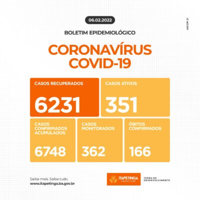 Os números de acordo com o Boletim Epidemiológico deste domingo divulgado pela SMS: Casos Confirmados acumulados desde o início da pandemia: 6.748. Casos Ativos: 351. Casos Recuperados: 6.231. Casos Monitorados: 362. Óbitos: 166. Mais Informações no portal da prefeitura www.itapetinga.ba.gov.br/covid19