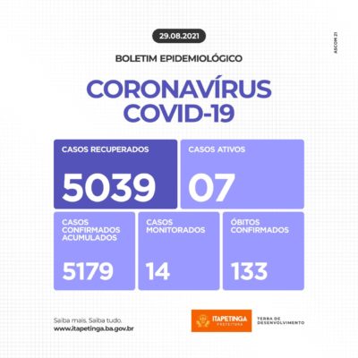 De acordo com o Boletim Epidemiológico deste domingo, 29/agosto, apenas 07 Casos Ativos são registrados em Itapetinga, mas a Secretaria Municipal de Saúde não mede esforços para zerar de uma vez por todas Casos Ativos no município. O índice vacinal em Itapetinga é grande, tanto para a primeira quanto para a segunda dose do imunizante. Mais Informações no portal da prefeitura www.itapetinga.ba.gov.br/covid19
