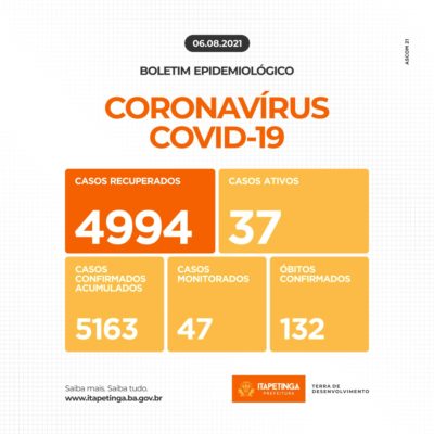 Em Itapetinga, apesar dos 34 Casos Ativos que vêm sendo monitorados pela Vigilância Eídemiológica, o município atingiu neste domingo, 08, a marca de 5.001 Casos Recuperados (São 5.001 Pacientes Infectados pela COVID-19 foram Recuperados da doença desde o início da pandemia). Lamentavelmente morreram 132 pessoas que foram contaminadas e tiveram agravemento do quadro para óbito no mesmo período (desde março de 2020)...