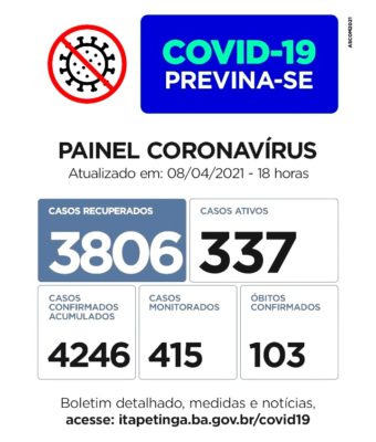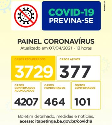 Casos Ativos: 377 / Casos Monitorados: 464 / Óbitos: 101. Estávamos há quatro dias sem registro de óbitos em decorrência da doença no município, mas houve informação de uma morte de um itapetinguense, no Hospital Costa do...