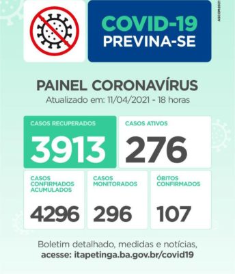 Casos Confirmados pela Secretaria Municipal de Saúde desde o início da pandemia: 4.299, mas no Mapa da COVID da Sesab, Itapetinga aparece com 4.491 registros, discrepância de 192 casos entre os dados do município e da Sesab. Casos Recuperados: 3.943 (isso representa 92% de todos os casos confirmados acumulados desde o início da pandemia) / Casos Ativos: 249 / Monitorados: 291 / Óbitos: 107. Mais Informações no portal da...