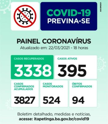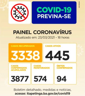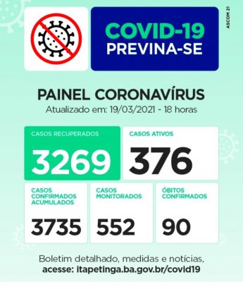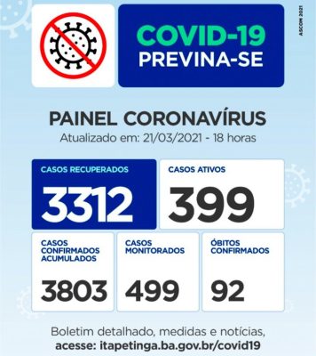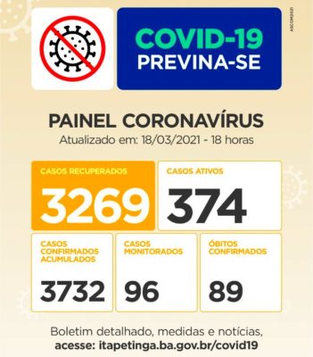 Pessoas Recuperadas: 3.269 / Casos Confirmados desde o início da pandemia: 3.735 Casos registrados pela SMS. Já no Mapa da COVID da Sesab, Itapetinga aparace com 3.955 Casos, com 17 Casos aguardando validação da Sesab. Casos Monitorados: 552 / Óbitos: 90. Mais Informações acesse www.itapetinga.ba.gov.br/covid19