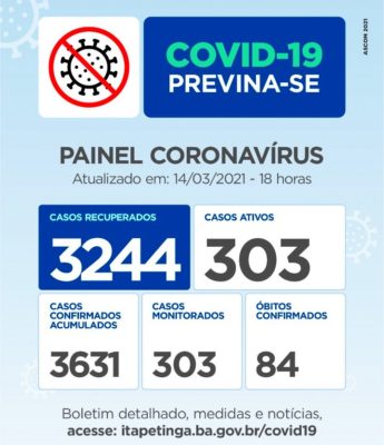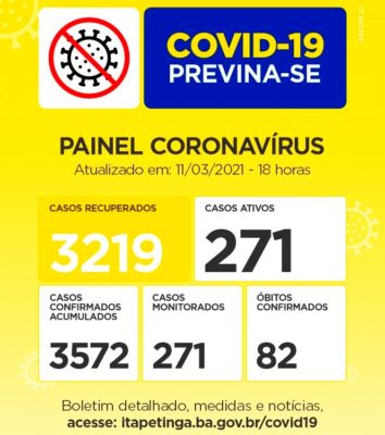 O município tem agora 3.219 Pessoas Recuperadas da doença. Casos Confirmados: 3.572 (acumulado desde o início da pandemia), mas no Mapa COVID-19 da Sesab, Itapetinga aparece com 3.713, com 02 casos aguardando validação. Casos Ativos: 271 / Monitorados: 271 / Óbitos: 82.