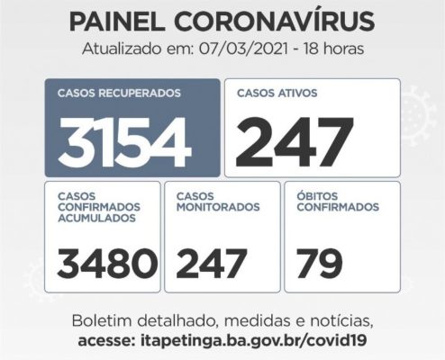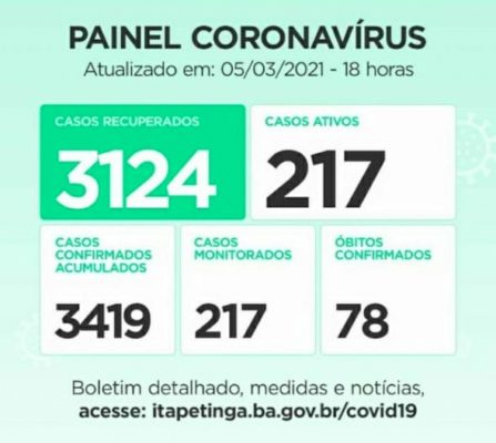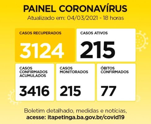 Itapetinga tem 3.124 Pessoas Recuperadas da doença. Casos Confirmados: 3.416 (acumulado desde o início da pandemia), mas no Mapa COVID-19 da Sesab, Itapetinga aparece com 3.559, com 07 Casos aguardando validação. Casos Ativos: 215 / Monitorados: 215 / Óbitos: 77. Estamos há cinco dias sem registro de óbito em decorrência da doença, o último foi registrado no dia 28 de fevereiro.