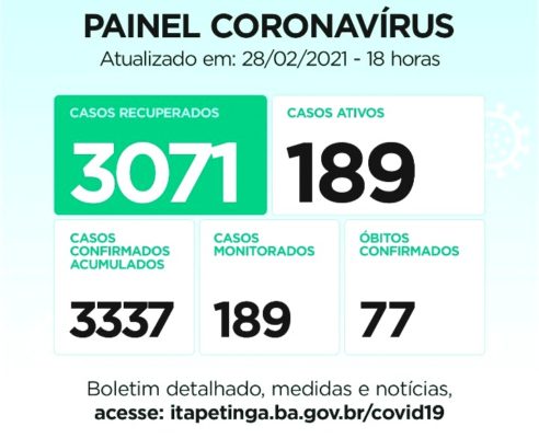 Casos Confirmados: 3.399 (acumulado desde o início da pandemia), mas no Mapa COVID-19 da Sesab, Itapetinga aparece com 3.527, com 04 Casos aguardando validação da SESAB. Casos Ativos: 228 / Monitorados: 228 / Óbitos: 77.