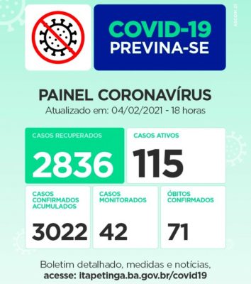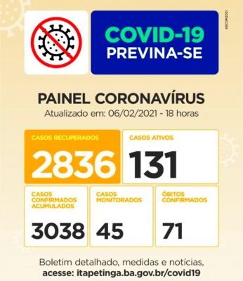 Painel Coronavírus para esta Sexta-feira: Casos Confirmados: Pela Secretaria Municipal de Saúde: 3.022, pela SESAB: 3.116, diferença de 94 casos não considerados pela Secretaria de Saúde do município. Casos Ativos: 115 / Casos Monitorados: 42 / Óbitos: Eram 70, agora são...