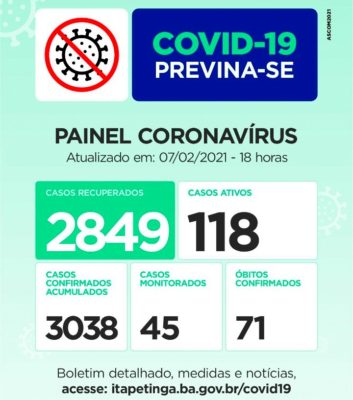 Painel Coronavírus para esta Quinta-feira: Casos Confirmados: Pela Secretaria Municipal de Saúde: 3.021, pela SESAB: 3.113, diferença de 92 casos não considerados pela Secretaria de Saúde do município. Casos Ativos: 115 / Casos Monitorados: 37 / Óbitos: 70 / Casos Descartados: Passam de 6 .100.