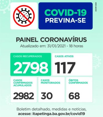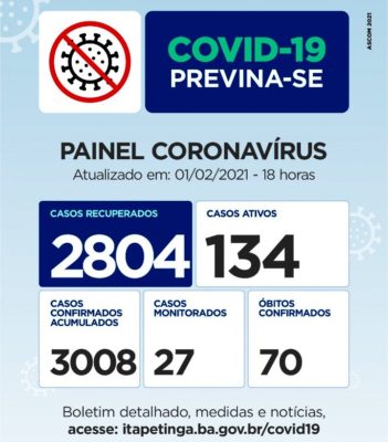 Durante o final de semana (período de 72 horas, que compreende entre os dias de sexta, sábado e domingo), a Secretaria Municipal de Saúde de Itapetinga registrou apenas 11 novos Casos de Pessoas Contaminadas da COVID-19 e 24 de Pessoas Recuperadas da doença no mesmo período. Estamos há cinco (05) dias sem registro de óbito em decorrência da COVID, o último foi notificado no dia 26 de janeiro, uma mulher, que morreu em Itabuna após complicação da doença.