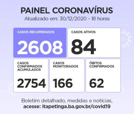 O Painel Coronavírus para esta quinta-feira ficou assim: Casos Confirmados: 2.754 (acumulados desde o início da pandemia), mas no MAPA da COVID-19 da Sesab, Itapetinga aparece com 2.810 Casos Confirmados. Casos Ativos: 84. Casos Recuperados: 2.608 / Monitorados: 166 / Óbitos: 66 - com a inclusão dos últimos dois casos da sexta-feira de Natal.