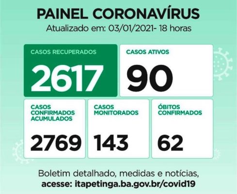 O Painel Coronavírus para esta segunda-feira ficou assim: Casos Confirmados: 2.769 (acumulados desde o início da pandemia), mas no MAPA da COVID-19 da Sesab, Itapetinga aparece com 2.820 Casos Confirmados. Casos Ativos: 90. Casos Recuperados: 2.617 / Monitorados: 143 / Óbitos: 62. Mais Informações acerca da COVID em Itapetinga basta acessar o portal da Prefeitura Municipal no endereço eletrônico a seguir... www.itapetinga.ba.gov.br/covid19