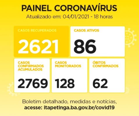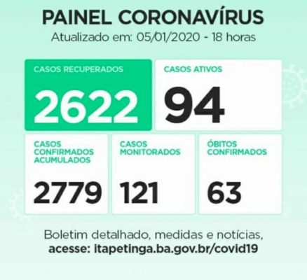 O Painel Coronavírus para esta terça-feira ficou assim: Casos Confirmados: 2.769 (acumulados desde o início da pandemia), mas no MAPA da COVID-19 da Sesab, Itapetinga aparece com 2.831 Casos Confirmados. Casos Ativos: Eram 90, agora são 86. Casos Recuperados: 2.621 / Monitorados: Eram 143, agora são 128 / Óbitos: Permanecem 62 desde o início da pandemia.