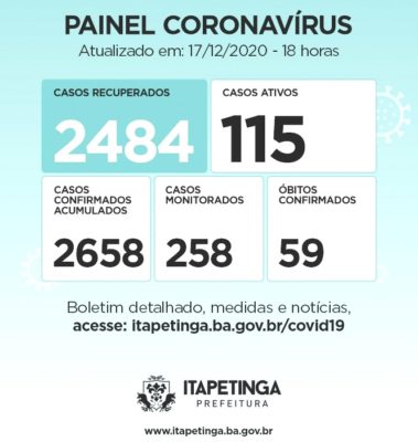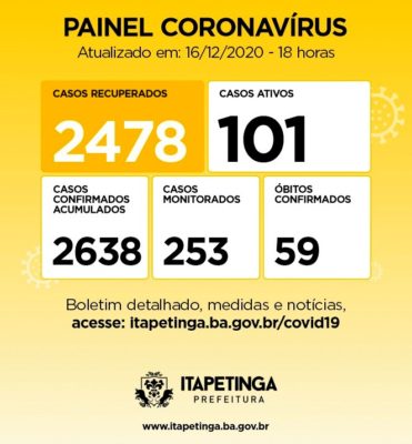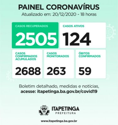 PAINEL CORONAVÍRUS ITAPETINGA: 116 CASOS ATIVOS, 2.495 CASOS RECUPERADOS, 2.670 CASOS ACUMULADOS E 59 ÓBITOS…