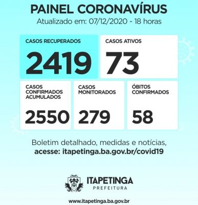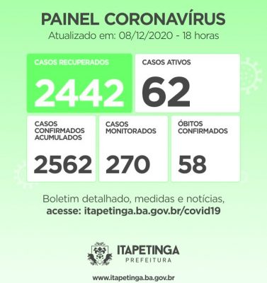 Painel Coronavírus Itapetinga para esta quarta-feira, 09 de dezembro: Casos Confirmados: 2.562,...