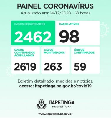 Painel Coronavírus Itapetinga para esta terça-feira, 15 de dezembro: Casos Confirmados: 2.619, mas no MAPA da COVID da SESAB, Itapetinga aparece com 2.678 (02 casos aguardando validação da SESAB) / Casos Recuperados: 2.462 / Casos Ativos: Eram 77, caíram para 75 no domingo, subiram para 98 no dia de ontem / Casos Descartados: Passam de 5.500 / Óbitos: Eram 58...