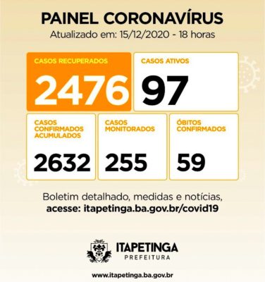 Painel Coronavírus Itapetinga para esta quarta-feira, 16 de dezembro: Casos Confirmados: 2.632 (acumulados desde o início da pandemia), mas no MAPA COVID-19 DA SESAB, o município de Itapetinga aparece com 2.680 Casos Confirmados. Casos Recuperados: 2.476 / Casos Monitorados: 255 / Casos Ativos: Eram...