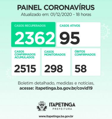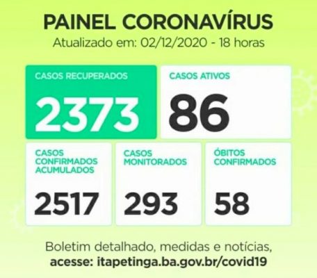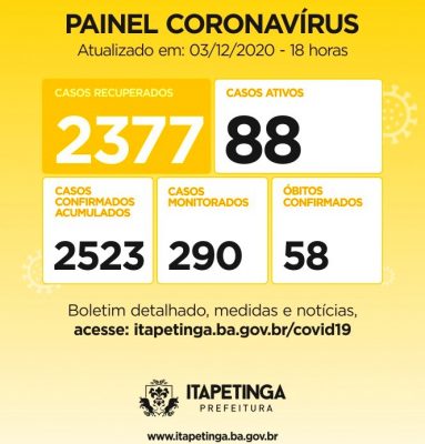 Painel Coronavírus Itapetinga para esta quinta-feira, 03/12, ficou assim: Casos Confirmados:...