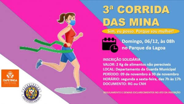 De iniciativas das mulheres da Guarda Municipal de Itapetinga será realizada a 3ª Corrida das Mina com o tema deste ano (Sim, eu posso, porque Sou Mulher!), no próximo dia 06 de dezembro, com saída às 8:00h da manhã, do Parque Poliesportivo da Lagoa. As inscrições que foram abertas no dia 09 de novembro até o dia 30, foram feitas na sede da Guarda Municipal, ao lado da 19ª CIRETRAN.