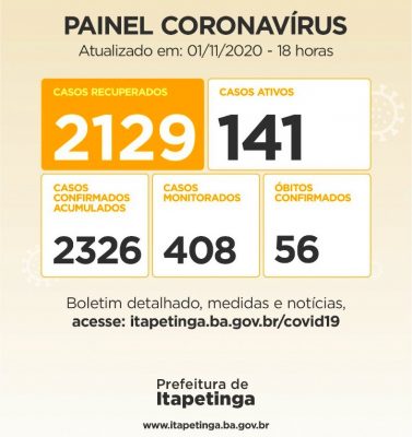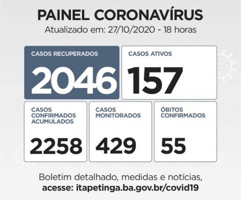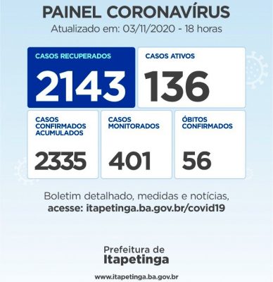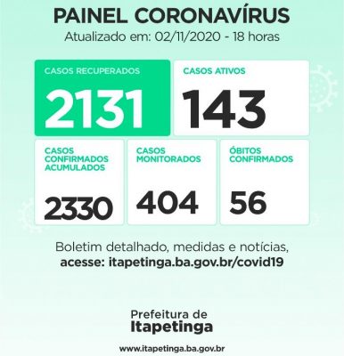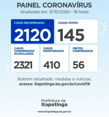 Em Itapetinga, no sudoeste baiano, distante 100 km de Vitória da Conquista, a Secretaria Municipal de Saúde notificou nas últimas 24 horas, 12 novos Casos de Pessoas Recuperadas da doença, e 05 novos Casos de Contaminação da COVID-19. O último óbito por COVID-19 foi registrado na última sexta-feira, 30/10/2020.