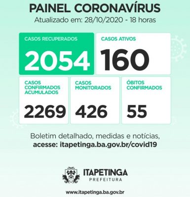 Painel Coronavírus da desta Quarta-feira, 28 de outubro: Casos Confirmados: 2.258 (acumulados, dos quais, 157 ainda são...
