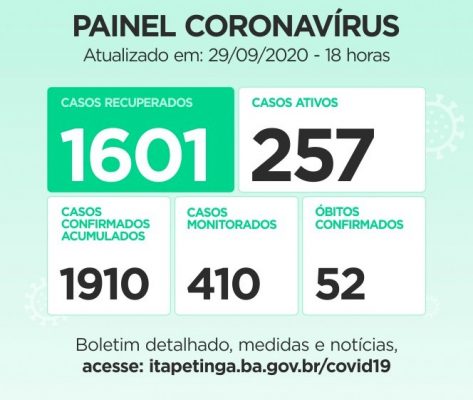 Painel Coronavírus para esta Quarta-feira, 30 de Setembro: Casos Confirmados: 1.910 (acumulados, dos quais, 257 ainda são considerados Ativos). Casos Recuperados: 1.601 / Monitorados: 410 / Casos Ativos: 257 / Casos Suspeitos: 96 / Óbitos: 52. Casos Descartados: Passam de 3.500.