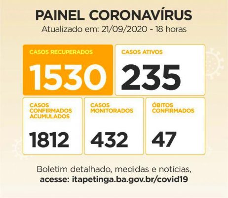 Itapetinga tem hoje, 1.530 Pessoas Curadas da doença. Infelizmente 47 Pessoas já morreram por causa da COVID no município, a maioria, pessoas idosas com comorbidades pré-existentes.
