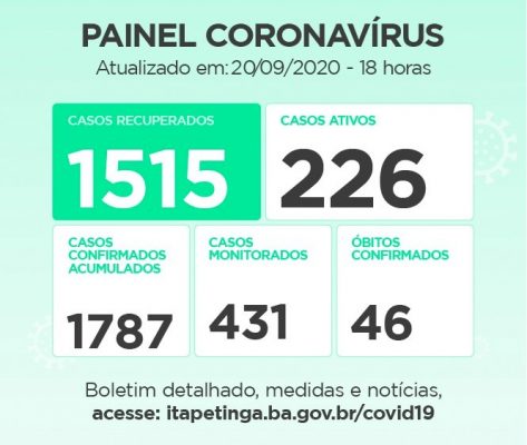 ITAPETINGA PAINEL CORONAVÍRUS: NAS ÚLTIMAS 24 HORAS FORAM REGISTRADOS 12 NOVOS CASOS DE CONTAMINAÇÃO E 10 PESSOAS FORAM RECUPERADAS DA DOENÇA…