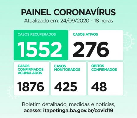 Painel Coronavírus para esta Sexta-feira, 25 de setembro: Casos Confirmados: 1.876 (acumulados, dos quais, 276 ainda são considerados Ativos). Casos Recuperados: 1.552 / Monitorados: 425 / Casos Ativos: 276 / Óbitos: 48. Casos Descartados: Passam de 3.350.