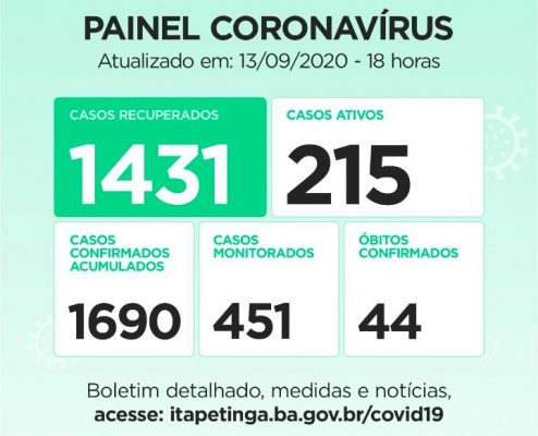 Com os dados atualizados pela Secretaria Municipal de Saúde, o Painel Coronavírus em Itapetinga ficou assim distribuído: Casos Confirmados: 1.690 (acumulados, dos quais, 215 ainda são considerados Ativos). Casos Recuperados: 1.431 / Casos Suspeitos: 49 / Monitorados: 451 / Casos Ativos: 215 / Óbitos: 44.