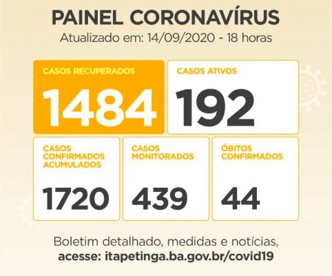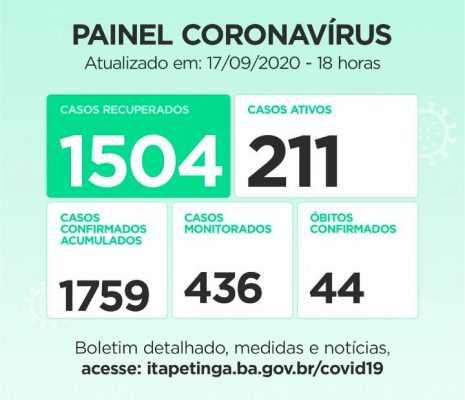 Com os dados atualizados pela Secretaria Municipal de Saúde, o Painel Coronavírus em Itapetinga ficou assim distribuído: Casos Confirmados: 1.759 (acumulados, dos quais, 211 ainda são considerados Ativos). Casos Recuperados: 1.504 / Monitorados: 436 / Casos Suspeitos: 35 / Casos Ativos: 211 / Óbitos: 44. Casos Descartados: 3.175.