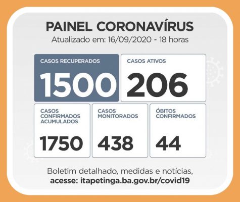 Com os dados atualizados pela Secretaria Municipal de Saúde, o Painel Coronavírus em Itapetinga ficou assim distribuído: Casos Confirmados: 1.750 (acumulados, dos quais, 206 ainda são considerados Ativos). Casos Recuperados: 1.500 / Monitorados: 438 / Casos Suspeitos: 76 / Casos Ativos: 206 / Óbitos: 44. Casos Descartados: 3.136.