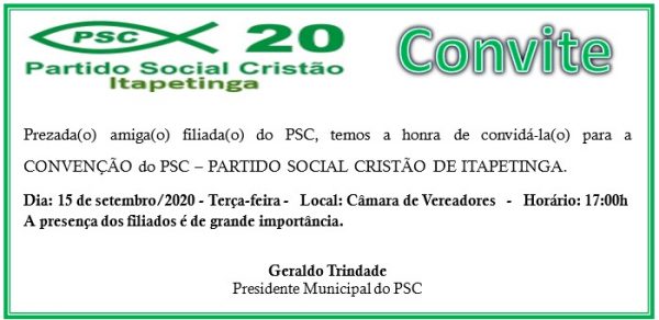 O PSC de Itapetinga é um partido da base do governo municipal que tem crescido muito nos últimos tempos, conquistou muitas adesões, nomes de pessoas da nossa comunidade que encontraram no PSC uma identidade própria, com a conservação dos valores éticos e morais.