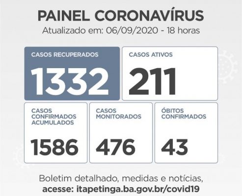 No período de seis dias, a partir do dia 01 de setembro até este domingo, 06, a Secretaria Municipal de Saúde notificou 106 novos Casos de Contaminação do novo Coronavírus no município e 01 óbito, mas o número de Casos Recuperados foi altamente superior, o que contribuiu para diminuir os Casos Ativos que eram 251 na última segunda-feira, 31/08, caiu para 211 neste domingo, 06. No sábado, 05, chegou a 203 Casos Ativos.