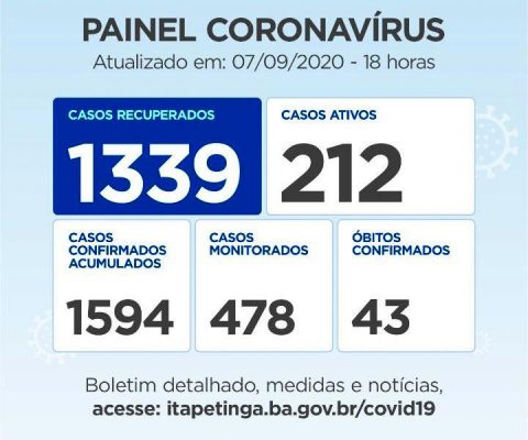 Em Itapetinga, no sudoeste baiano, nas últimas 24 horas a Secretaria Municipal de Saúde notificou 12 novos Casos de Contaminação do novo Coronavírus E 21 novos Casos de Pessoas Recuperadas da doença.