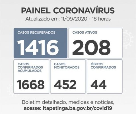 Com a atualização do Painel Coronavírus pela Secretaria Municipal de Saúde os números da COVID-19 ficaram assim: Casos Confirmados: 1.668 (acumulados, dos quais, 208 ainda são considerados Ativos).