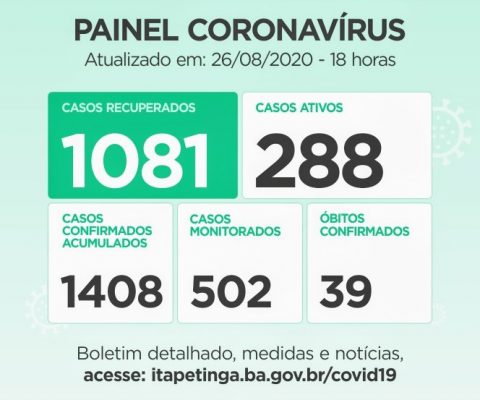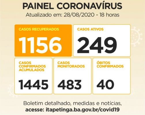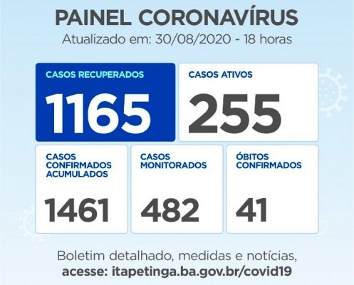 Como ficou o Painel Coronavírus em Itapetinga para este domingo, 30 de agosto de 2020: Casos Confirmados: 1.461 (acumulados, do quais, 255 ainda são considerados Ativos). Casos Recuperados: 1.165. Casos Ativos: 255. Óbitos: 41.