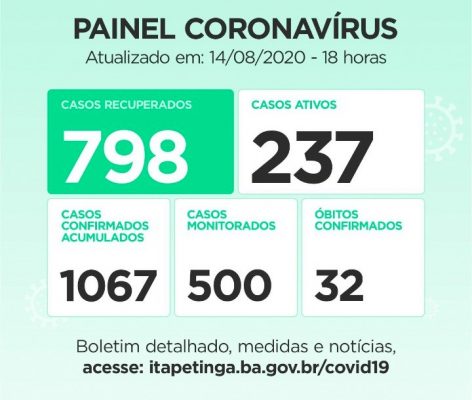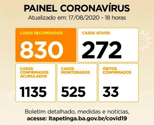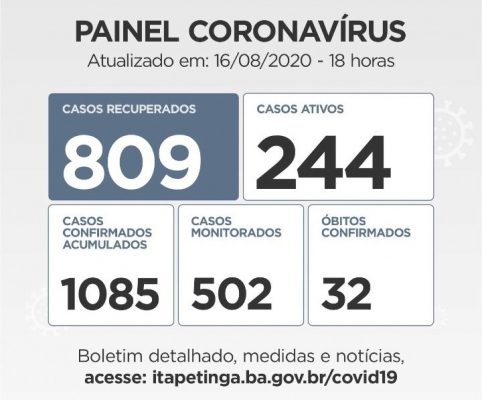 PAINEL COVID-19-ITAPETINGA REGISTRA 1.085 CASOS CONFIRMADOS E 809 PESSOAS RECUPERADAS DA DOENÇA NO MUNICÍPIO…