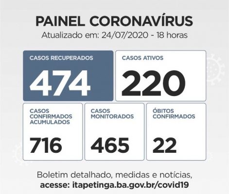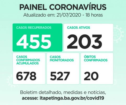 Itapetinga registrou nas últimas 24 horas, 23 novos Casos de Pessoas Contaminadas pelo novo Coronavírus, aumentando os números dos atuais 655 na última segunda-feira, 20/julho, para 678 Casos Confirmados até às 18:00h de ontem (sendo que 203 ainda são considerados Ativos)... A VIEP notificou 20 novos Casos de Pessoas Curadas da COVID-19, subindo para 455, mais do dobro do número de pessoas infectadas (Casos Ativos)...