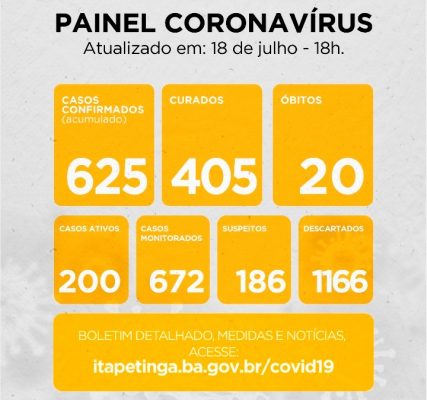 ITAPETINGA JÁ TEM MAIS DE 400 PESSOAS CURADAS DA COVID-19 / 625 CASOS CONFIRMADOS (ACUMULADOS / 200 ATIVOS) / 20 ÓBITOS…