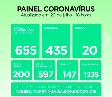 Itapetinga, município baiano localizado no sudoeste, registrou nas últimas 24 horas, 19 novos Casos Positivos de Covid-19, aumentando os números dos atuais 636 no domingo, 19/julho, para 655 Casos Confirmados até às 18:00h desta segunda, 20/julho (sendo que 200 ainda são considerados Ativos)... A VIEP notificou 25 novos Casos de Pessoas Curadas da COVID-19... Agora já são 435 Pessoas Curadas da doença no município.