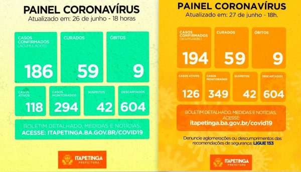No Boletim Epidemiológico COVID-19 Itapetinga deste sábado, 27, houve aumento de 08 novos Casos Confirmados, saltando de 196 para 194. Com as duas mortes (um idoso de 83 e uma senhora de 50 anos) confirmadas na sexta-feira, 26, saltamos de 07 para 09 Óbitos / Houve aumento dos Casos Monitorados que até a sexta, 26, eram 294 subiu para 349 neste sábado. Dos 194 Casos Confirmados (126 pela Secretaria Municipal de Saúde, 66 Laboratório Particular e 02 atribuídos pela SESAB / 126 são considerados Ativos) / Estamos com 42 Casos Suspeitos / 59 Pacientes Recuperados / 604 Casos Descartados (110 Laboratório e 494 Testes Rápidos) / Óbitos: 09...