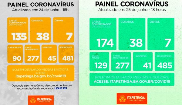 Com 01 óbito confirmado o número de infectados subiu para 36 e 17 curados. Portanto, Itororó tem 02 Óbitos e 17 pessoas com o vírus ativo sendo acompanhadas por profissionais que monitoram a evolução da doença.