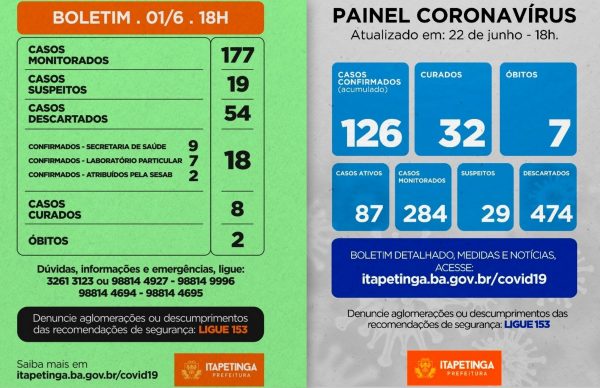 Do dia 01 de junho até às 18:00h desta segunda-feira, 22, os números da COVID-19 no município de Itapetinga dispararam. Até o dia 01 de junho, estávamos com os seguintes números: Casos Confirmados: 18 / Casos Monitorados: 177 / Casos...