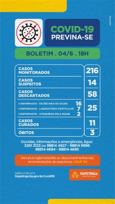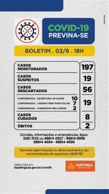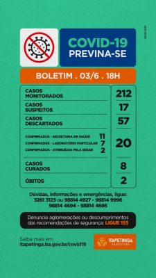 Na última sexta e sábado, Itapetinga recebeu 15 novos resultados de exame, 12 Descartados e 3 Confirmados para COVID-19. Na sexta, 29, um morador do Distrito Bandeira do Colônia, de 42 anos, que apresentou sintomas no último dia 17, no dia 21, deu entrada no hospital de Itororó com dispneia e alterações no raio-x de tórax. Pela apresentação do quadro, foi transferido para Vitória da Conquista no dia 24, onde permaneceu internado até sexta-feira.
