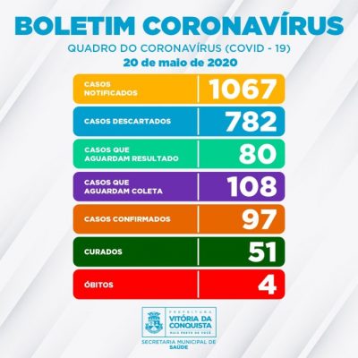 Com dois novos resultados positivos divulgados nesta quarta-feira (20), Vitória da Conquista registra, até o momento, o número de 97 pessoas infectadas pelo Novo Coronavírus. De acordo com Boletim epidemiológico emitido pela Secretaria Municipal de Saúde, dos pacientes que tiveram exames positivos, 51 evoluíram para cura e quatro para óbito (residentes do município). Ainda estão em recuperação 42 pacientes – nove hospitalizados e 33 em isolamento domiciliar.