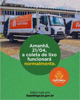 Terça-feira, 21 de abril, feriado nacional de Tiradentes, mas a prefeitura de Itapetinga manterá o serviço de coleta de lixo na cidade normalmente. A recomendação é que a população não coloque o lixo na rua antes do horário padrão, a fim de evitar que se espalhe pelas vias ou sejam revirados por animais, além de atrair urubus...