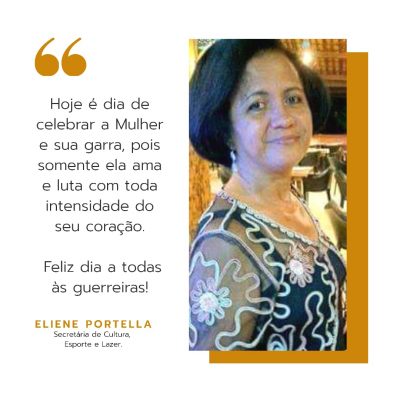 Hoje é dia de celebrar a Mulher e sua garra, pois somente ela ama e luta com toda intensidade do seu coração. Feliz dia a todas às guerreiras! Uma mensagem de Eliene Portella, Secretária de Cultura, Esporte e Lazer.