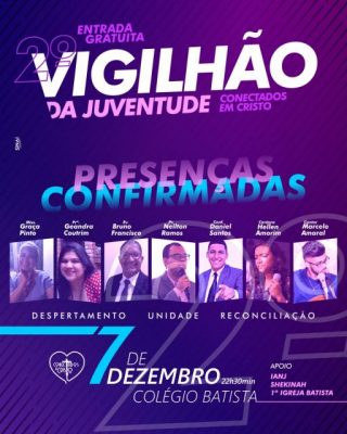 É com imensa felicidade e gratidão a Deus que o Grupo Conectados em Cristo anuncia oficialmente o 2º Vigilhão da Juventude, com todas as presenças já confirmadas! Dia 07 de dezembro, às 22:30, na quadra do Colégio Batista. Entrada gratuita.