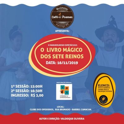 Que leva ao público diversão, alegria, música e muita Fantasia! Buscando levar ao público a construção e linguagem das crianças, o espetáculo ‘O Livro Magico dos Sete Reinos’ emúnica apresentação no dia 16 de novembro com sessões ás 15h e as 16:30h. O ingresso com valor promocional de R$ 3,00. O universo da peça é o espaço da imaginação, música, emoção, diversão e criatividade envolvendo as crianças e publico num ambiente de muita fantasia.