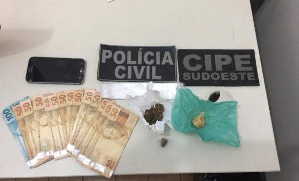 Uma equipe da Polícia Civil, liderada pelo Delegado Shangai Alexandre, com o apoio da guarnição da CIPE Sudoeste – Caesg, após denúncias anônimas de uma boca de fumo, procedeu as diligências e conseguiu encontrar Álvaro de Jesus Santana na casa onde reside, na última quinta-feira, 20, vendendo drogas para dois usuários, que fumavam crack no quintal.